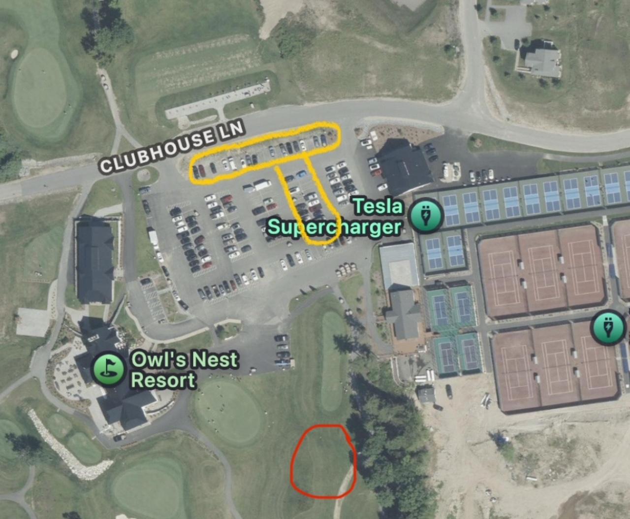 If Corridor 11 railroad tracks are in good conditions for riding. (Please stay connected on our Facebook page and website). You can park on the outer edge of the Owl’s Nest Golf course parking lot highlighted in yellow. If these sections of the lot are full, DO NOT park in other parts of the lot, you risk being towed at vehicle owners’ expense and loss of club privileges of use. The area circled in red is a parking area for snowmobiles for those that travel by sled if snow allows.